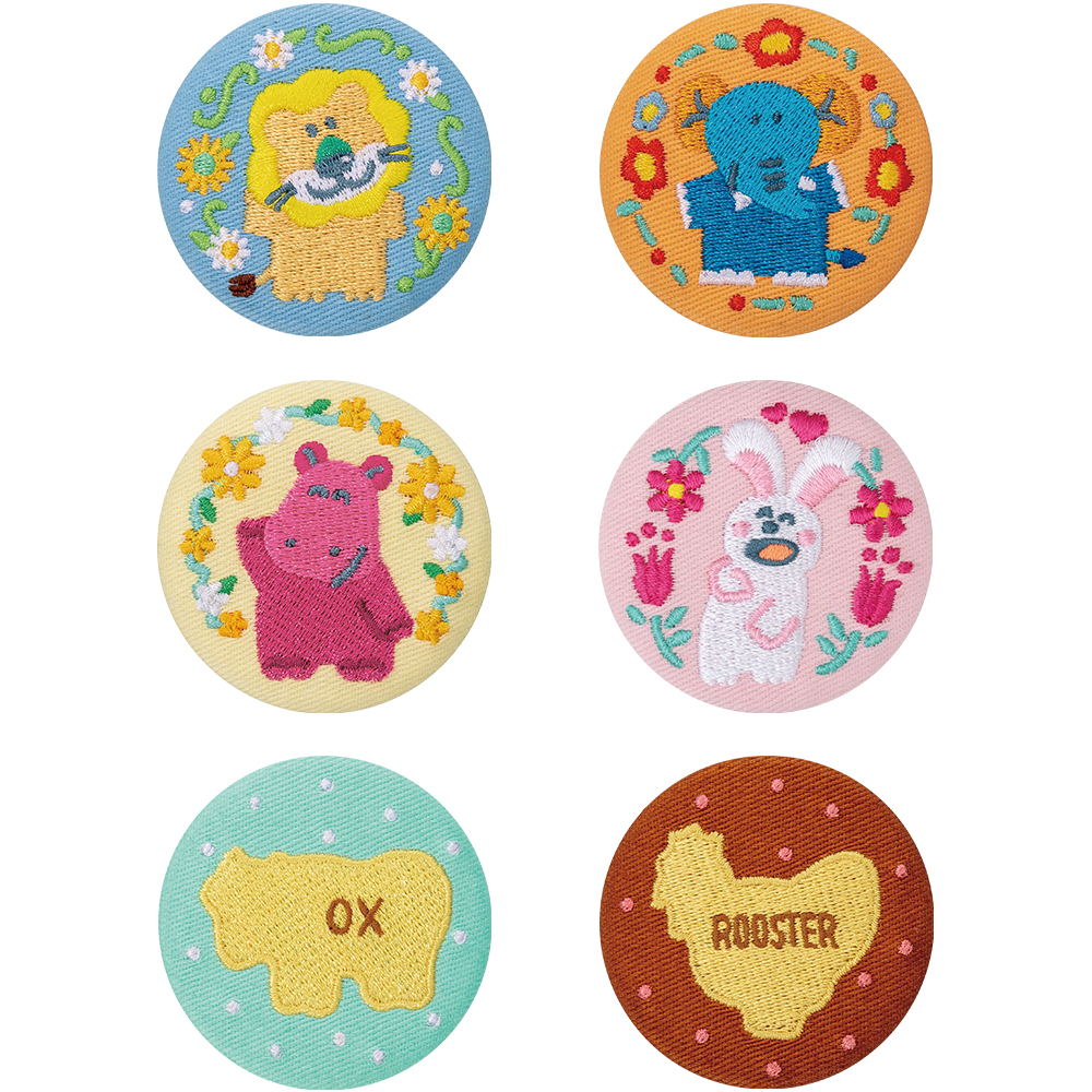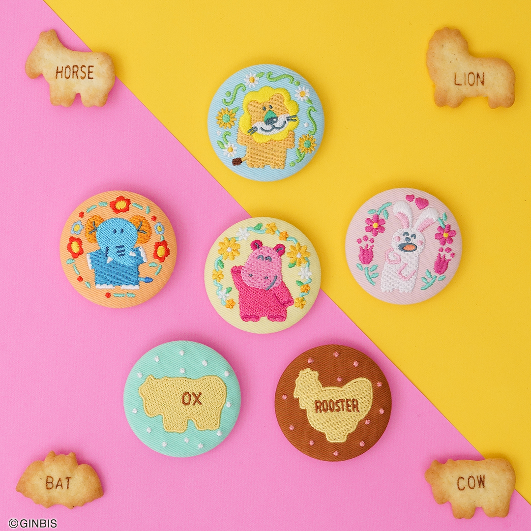らいおんくんたちのキャラクターとビスケット柄の刺繍缶バッジが、E賞にて展開。