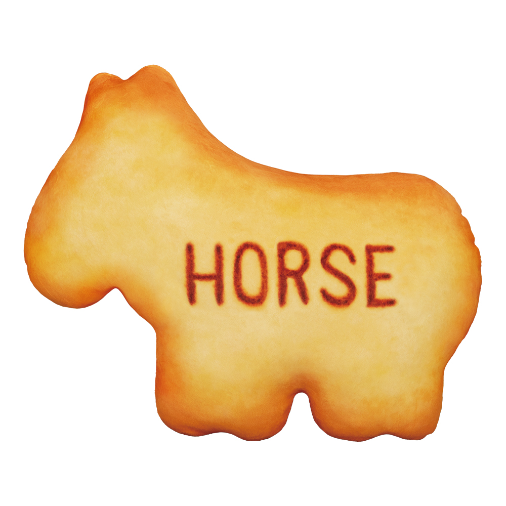 A賞に展開される「HORSE」のビスケット型クッション。