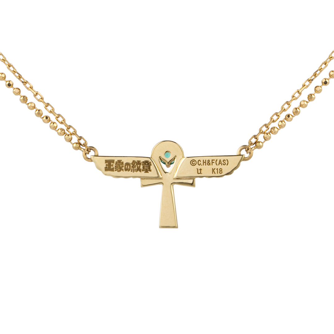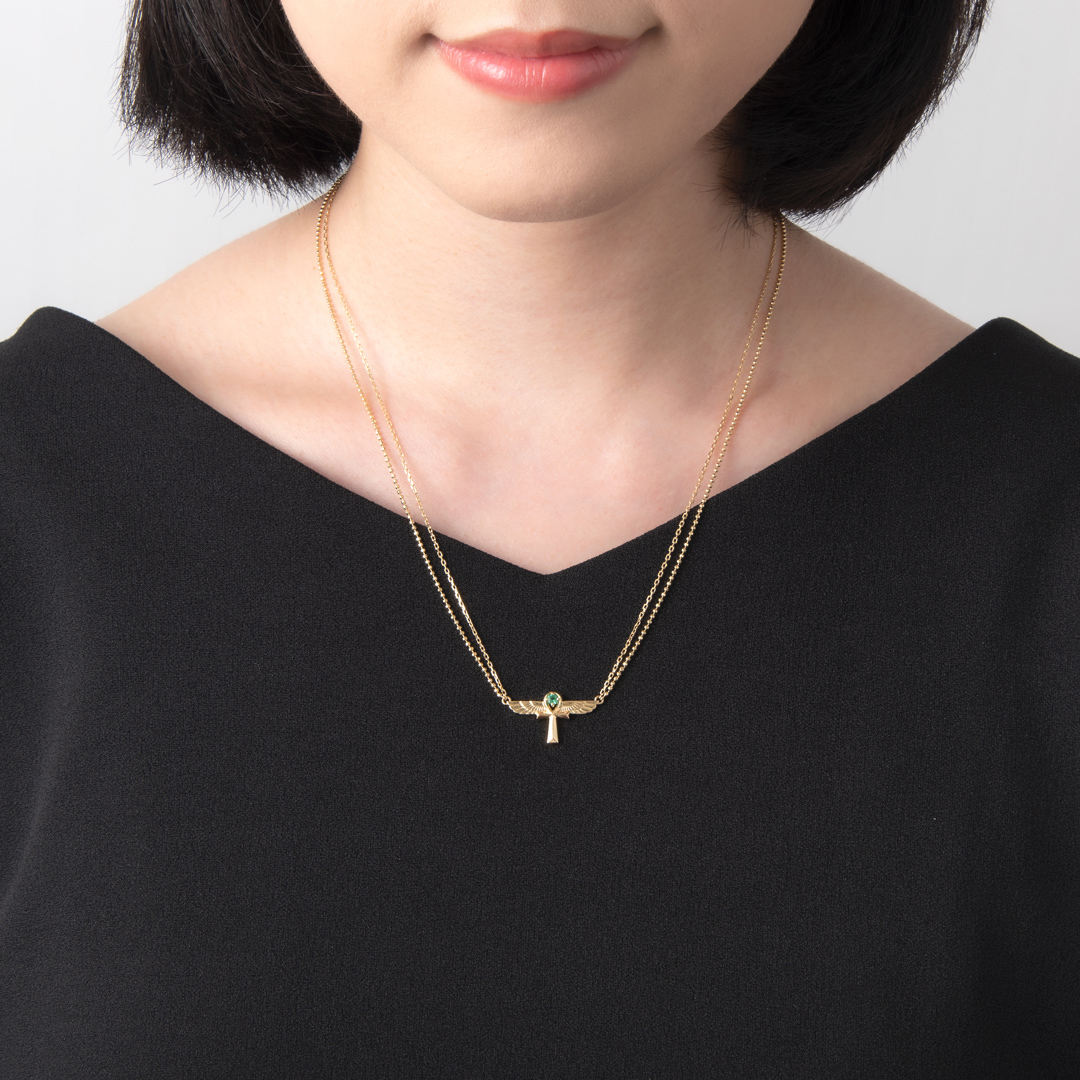 アンクと呼ばれる古代エジプトで使用された「生命」をあらわす言葉を表現したヒエログリフをモチーフに、中心にはエメラルドを留め、鷹の翼を組み合わせたネックレスです。