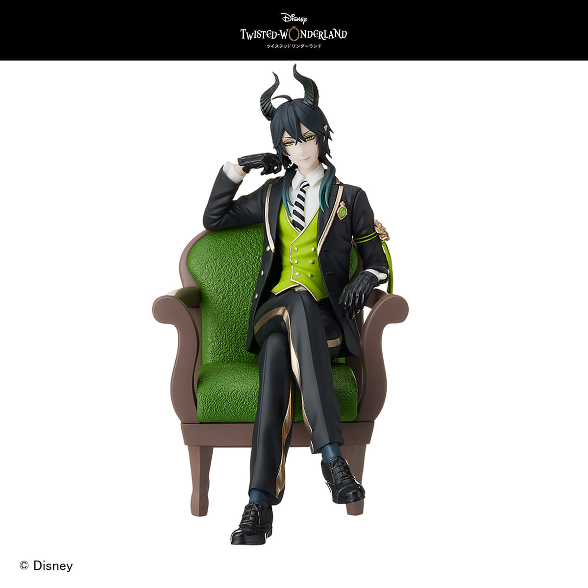 寮カラーの椅子に深く腰掛け、脚をクロスさせた制服姿の「マレウス・ドラコニア」が全高約13センチで立体化されています。