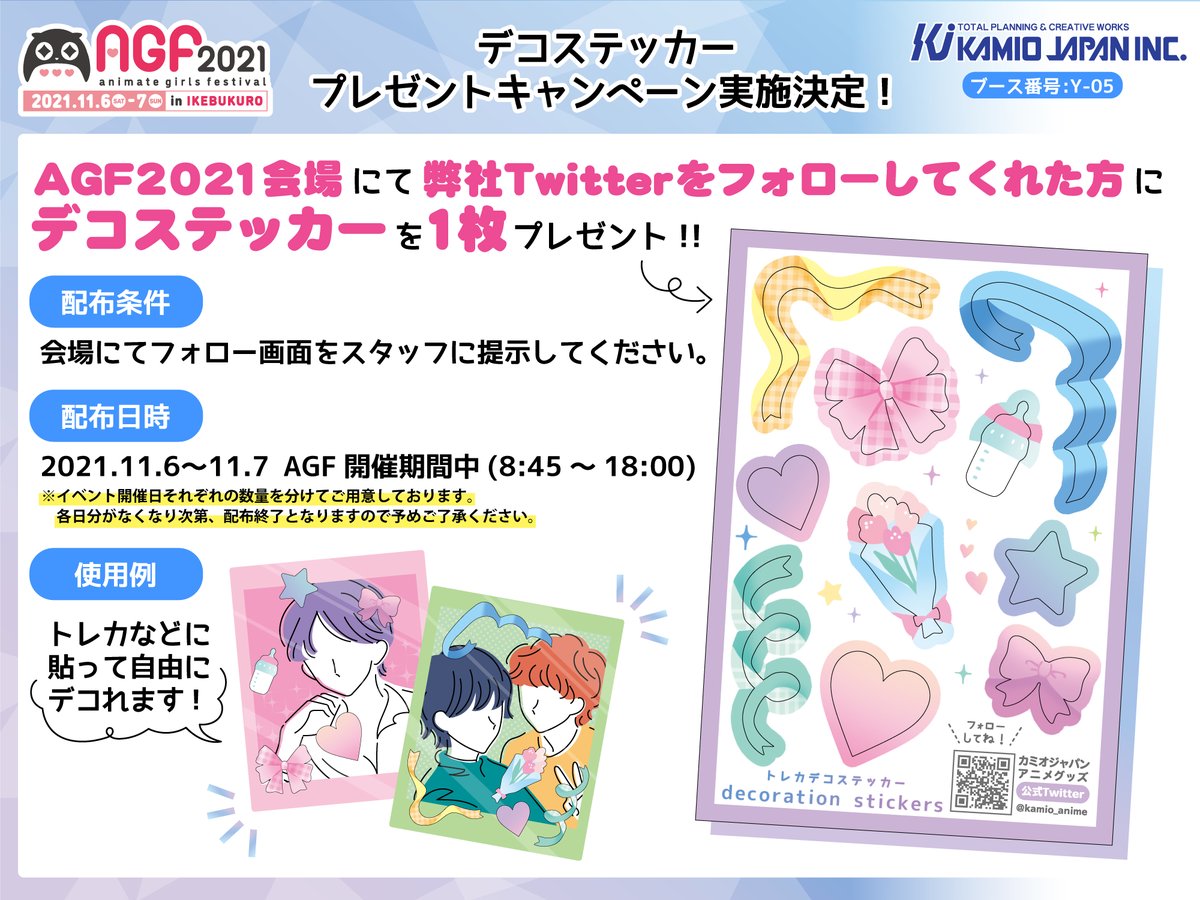 カミオジャパンが発売するアニメ関連新グッズ情報を掲載するTwitterアカウント「カミオジャパンアニメ(@kamio_anime)」をフォローして、『アニメイトガールズフェスティバル2021(AGF)』のカミオジャパンブースにて、フォロー画面をスタッフに掲示するだけでオリジナルのデコステッカーがもらえます☆