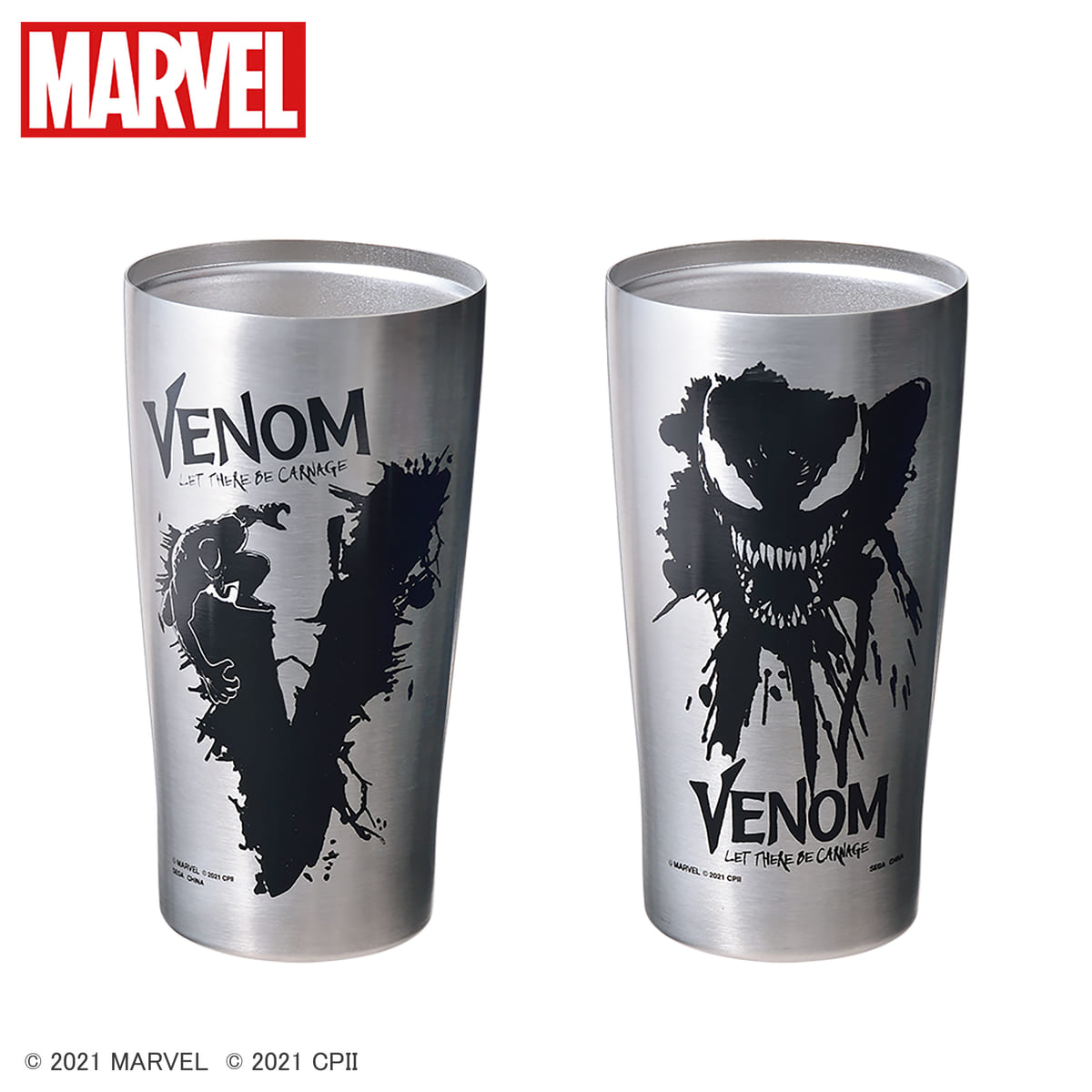 頭文字である「V」をかたどった飛沫模様のなかに構える「ヴェノム」の姿がかっこいい、ステンレスタンブラー。