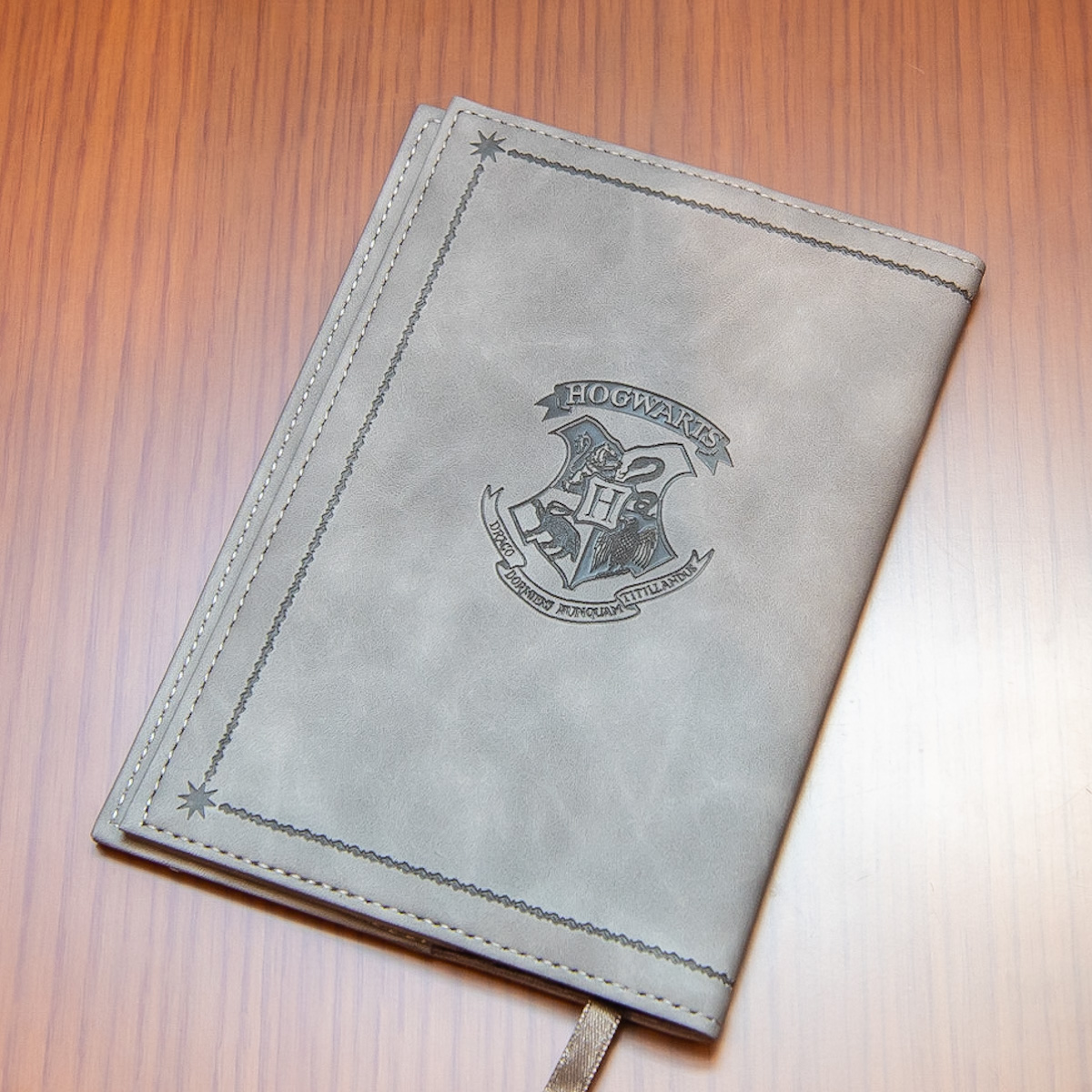 表面にホグワーツの紋章が型押しされたブックカバー。