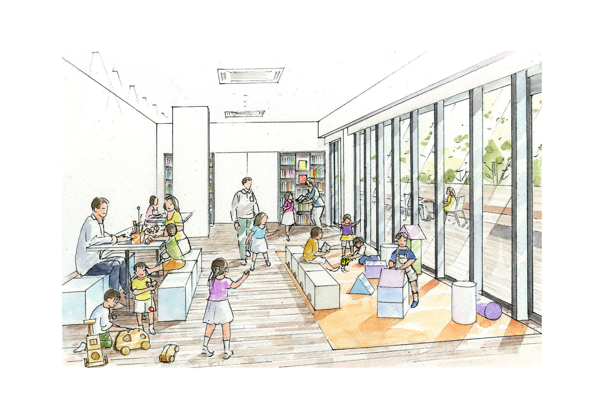 室内は幼児向けの木製のおもちゃ、ソフトブロック、絵本などが取り揃えられ、小さな子どもの知的好奇心をくすぐる空間に。