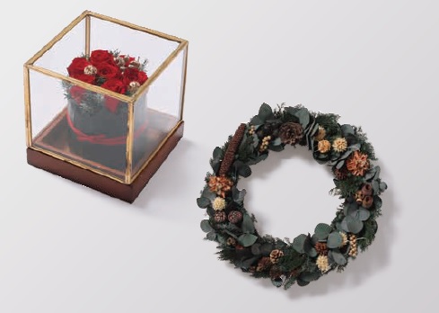 (右)プリザーブドフラワー・クリスマスリース(直径約35cm):13,200円(税込)