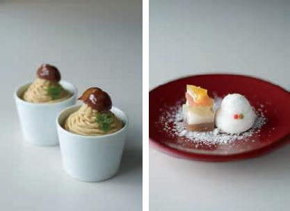 生クリームと九州産の刻み栗を層にした和風モンブラン(左)と、薯蕷製の雪だるまと色とりどりの羊羹を重ねてツリーを表現した和菓子(右)