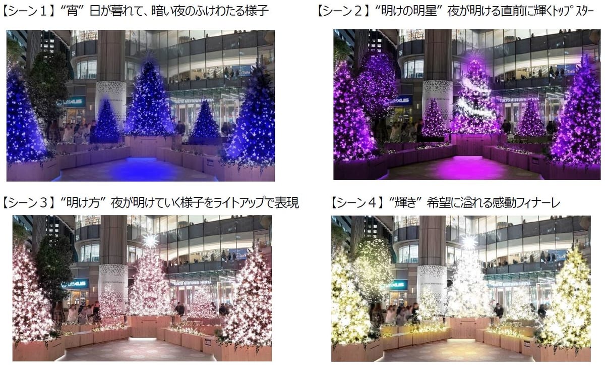 画面上に“明けの明星”をモチーフにした流星が動き出し、BGMとともに無数の光のきらめきでツリーを包み込みます。