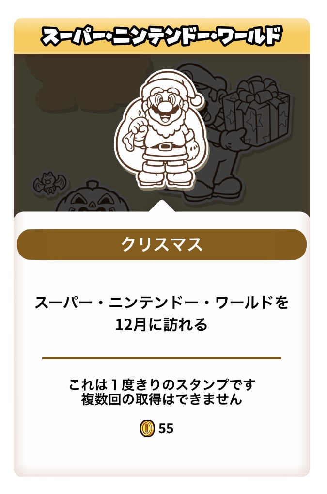 12月にだけ獲得できる来場記念スタンプのデザインは“クリスマスバージョン”のマリオ
