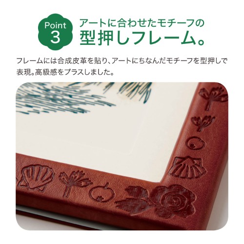 合成皮革を貼ったフレームには、アートにちなんだモチーフが型押しで表現。