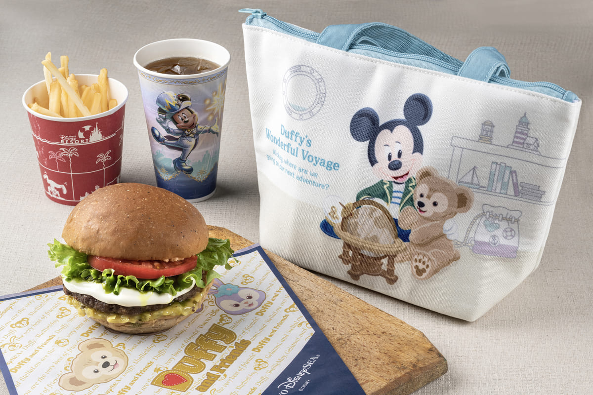トロっとしたチーズクリームにバジルソースとトマトがマッチしたボリューム感たっぷ りのハンバーガーが楽しめるセットには、ダッフィーとミッキーがふたり仲良く旅の計画を立てているデ ザインがかわいらしいスーベニアランチケースをつけることができます。
