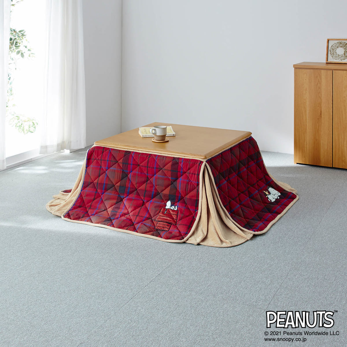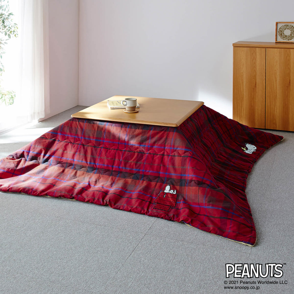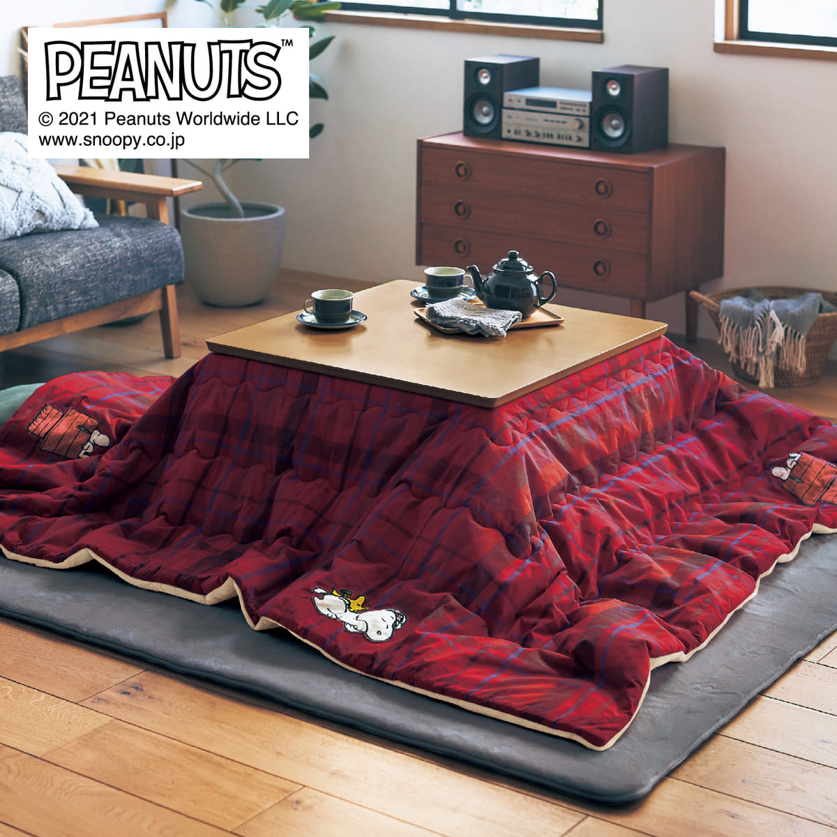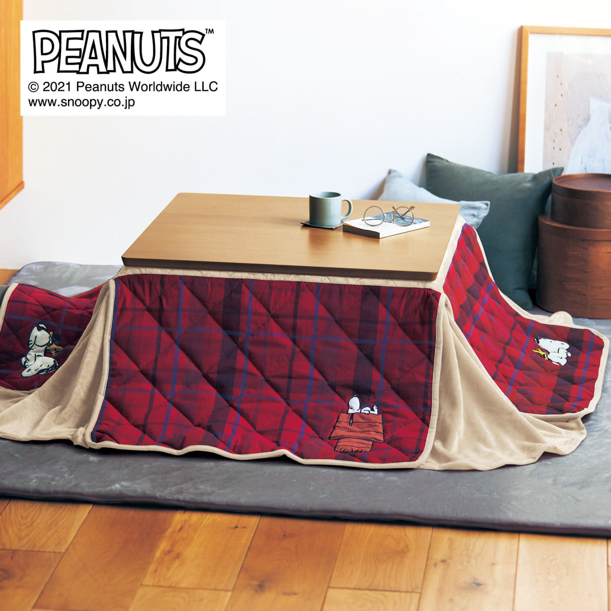 冬のリビングに使いたい、「スヌーピー」先染めチェックのこたつ布団。