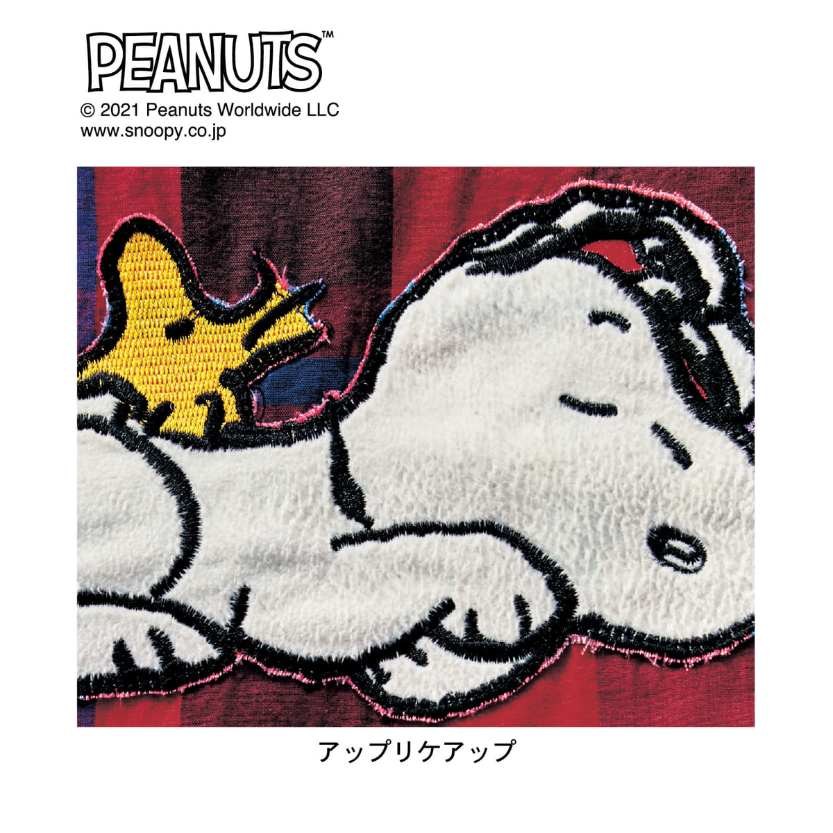 隅に「スヌーピー」のくつろぐ姿をアップリケであしらった、可愛いデザインです。