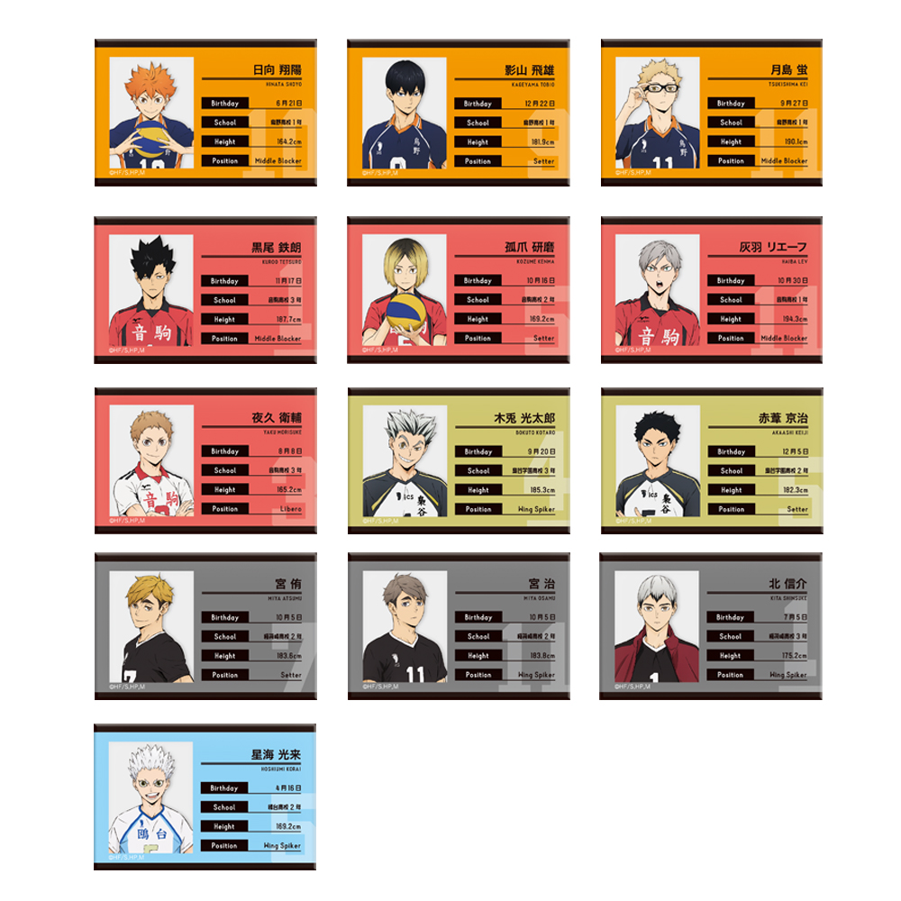 烏野高校より「日向翔陽」「影山飛雄」「月島蛍」、音駒高校より「黒尾鉄朗」「孤爪研磨」「灰羽リエーフ」「夜久衛輔」、梟谷学園高校より「木兎光太郎」「赤葦京治」、稲荷崎高校より「宮侑」「宮治」「北信介」、鴎台高校より「星海光来」の全13種がラインナップされています。