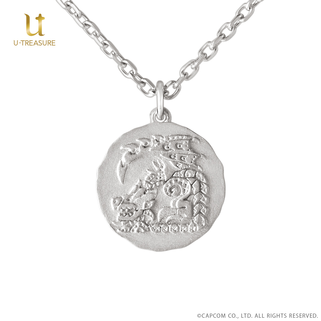 「リオレイア」と「リオレウス」のアイコンが、丸いシルバープレートに浮き彫りで表現されたネックレス。