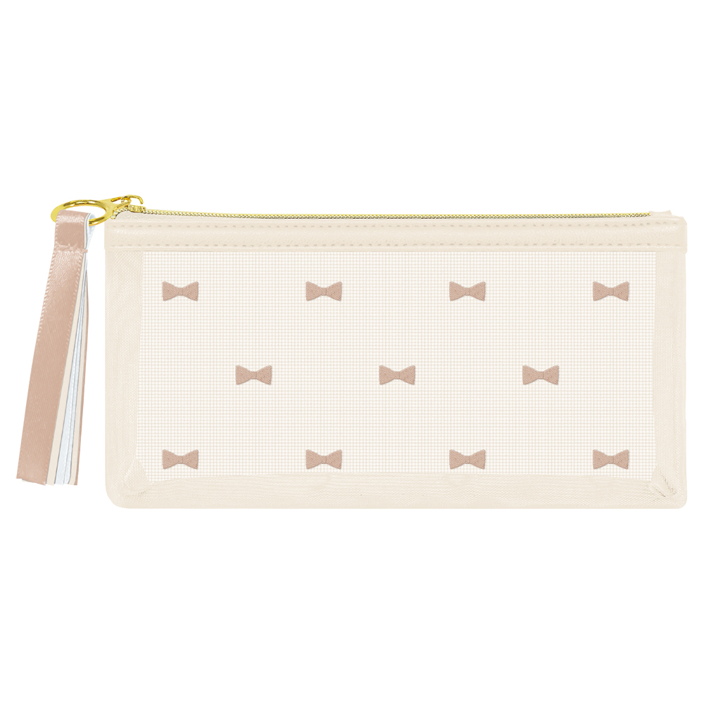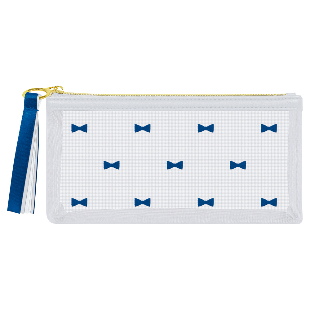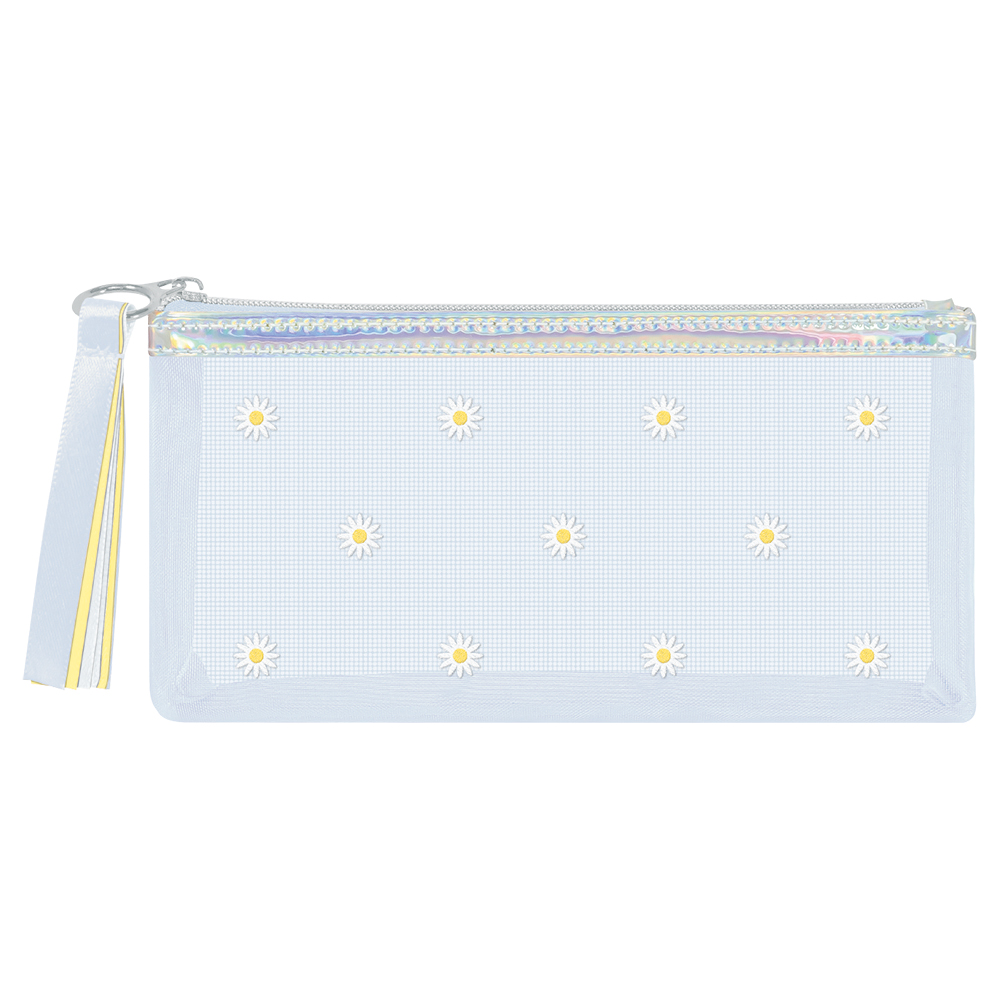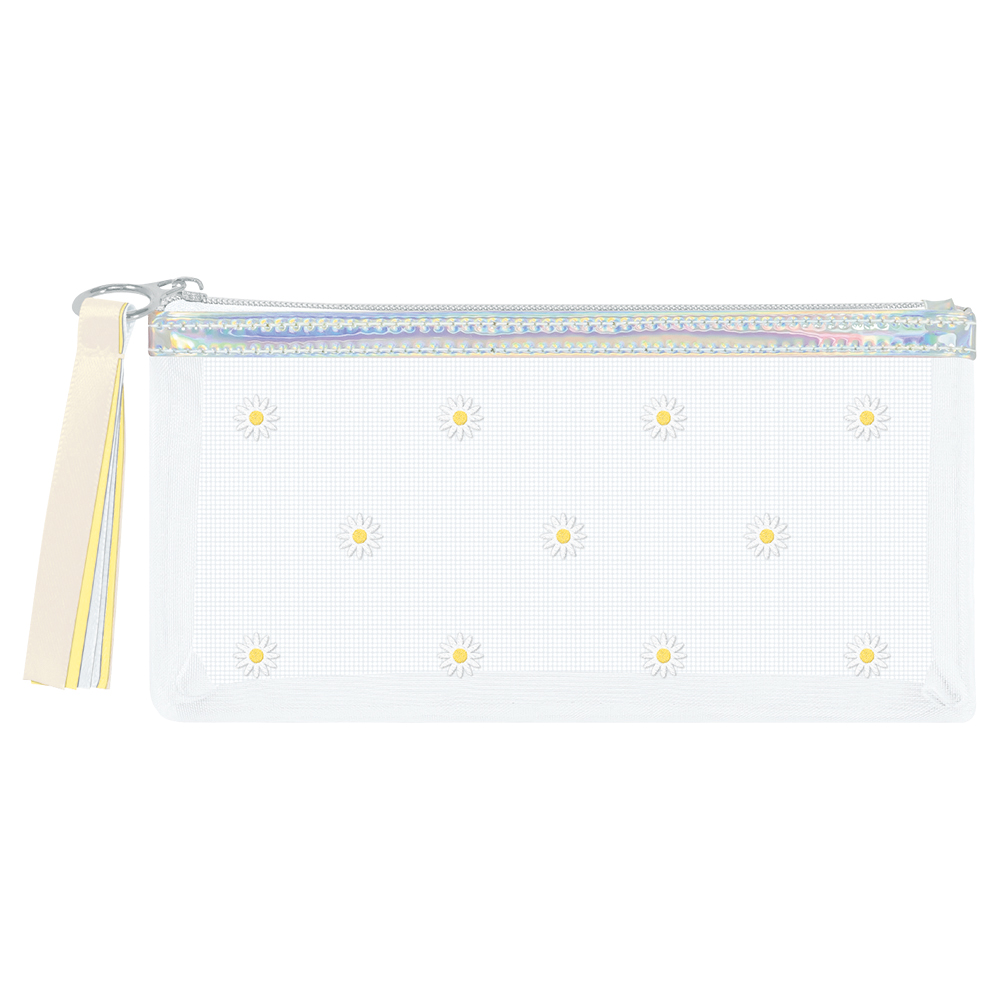 細メッシュ生地に、デイジーやリボンの刺繍が施された、大人かわいいペンケースです。