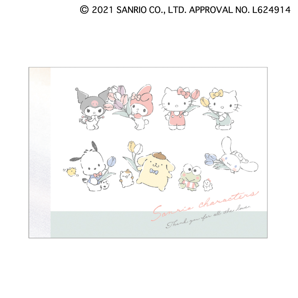 「クロミ」や「マイメロディ」「ハローキティ」「ハローミミィ」「ポチャッコ」「ポムポムプリン」「けろけろけろっぴ」「シナモロール」がチューリップを贈りあっているような、ハッピーなデザインです。