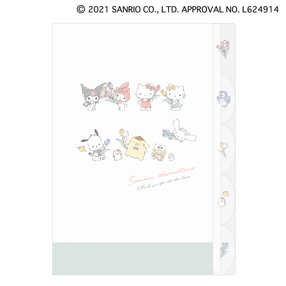 インデックスにはチューリップのほか「パタパタペッピー」や「ポムポムプリン」のお友だちの「マフィン」が、裏面には「ウサハナ」「リトルツインスターズ」「タキシードサム」「ウィッシュミーメル」「パタパタペッピー」がいます☆