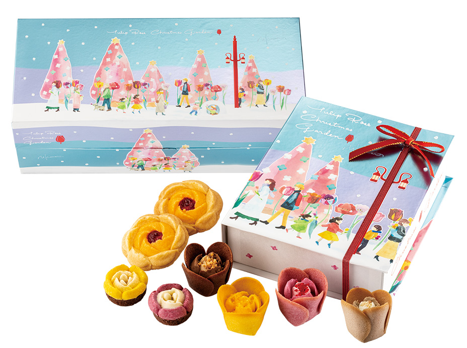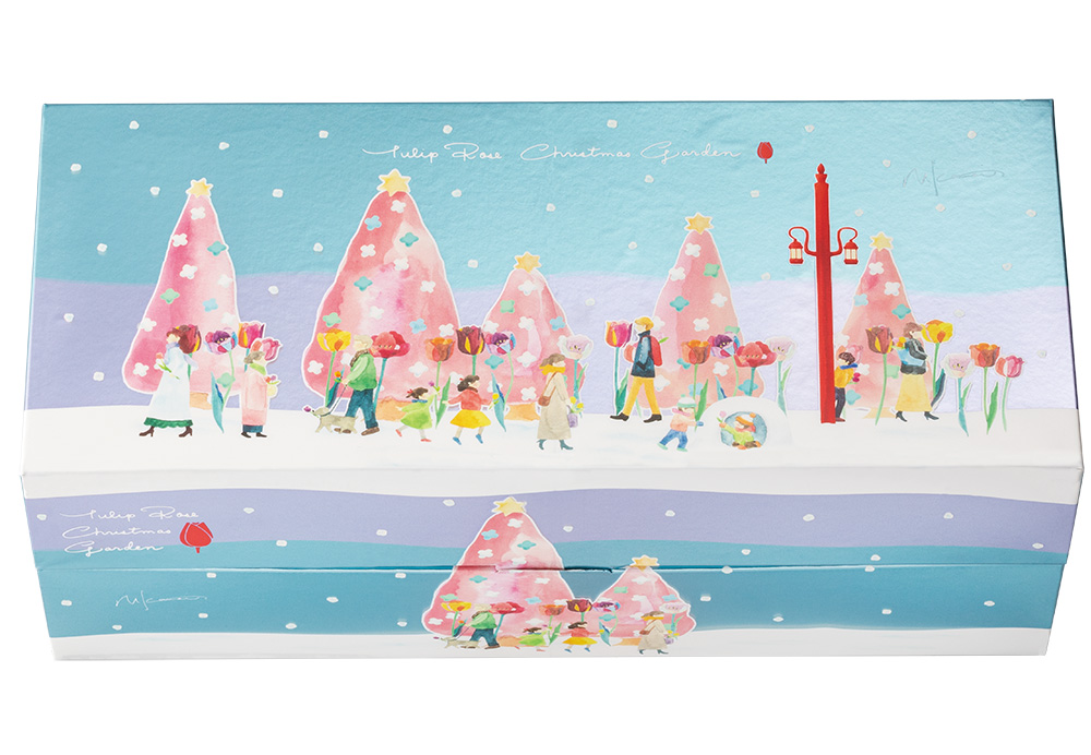 お花のスイーツがあふれだす2段重ねの豪華なボックスは、チューリップタウンの陽気な街角を行き交う人々を描いたクリスマス限定デザイン。
