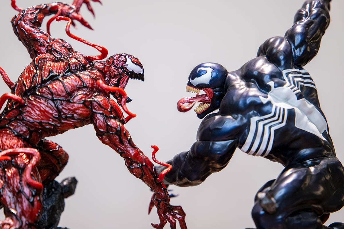 「スパイダーマン」のフェイスアートを背景に、バトルを繰り広げる「ヴェノム」と「カーネイジ」のほか