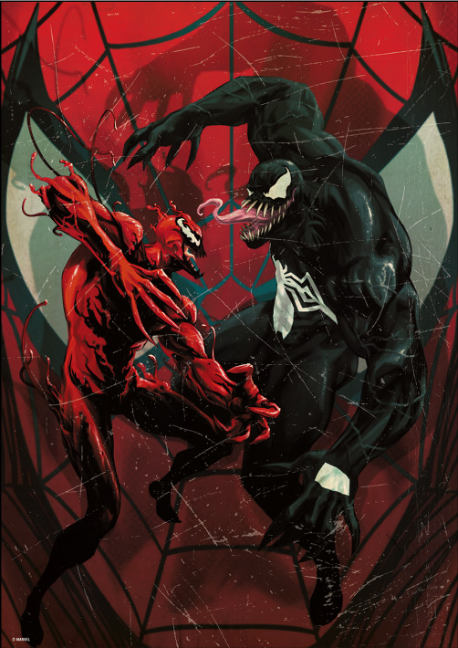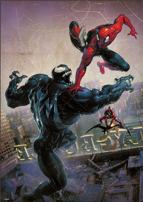 破壊された都市を背景に「スパイダーマン」「ヴェノム」「カーネイジ」が描かれたものや