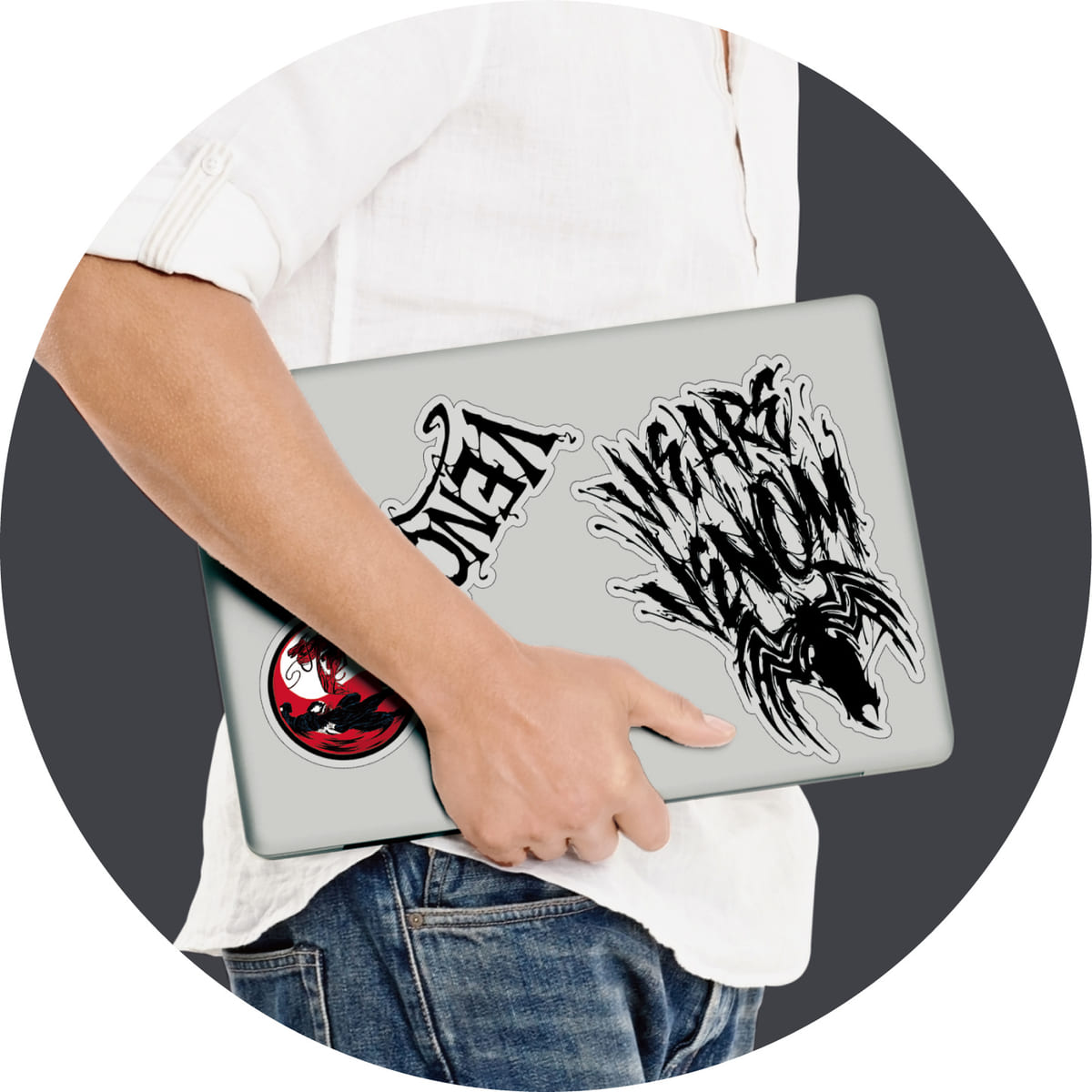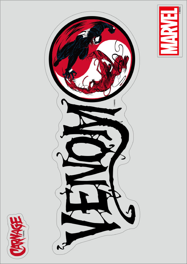 円の中に「ヴェノム」と「カーネイジ」のアートが落とし込まれたステッカーや