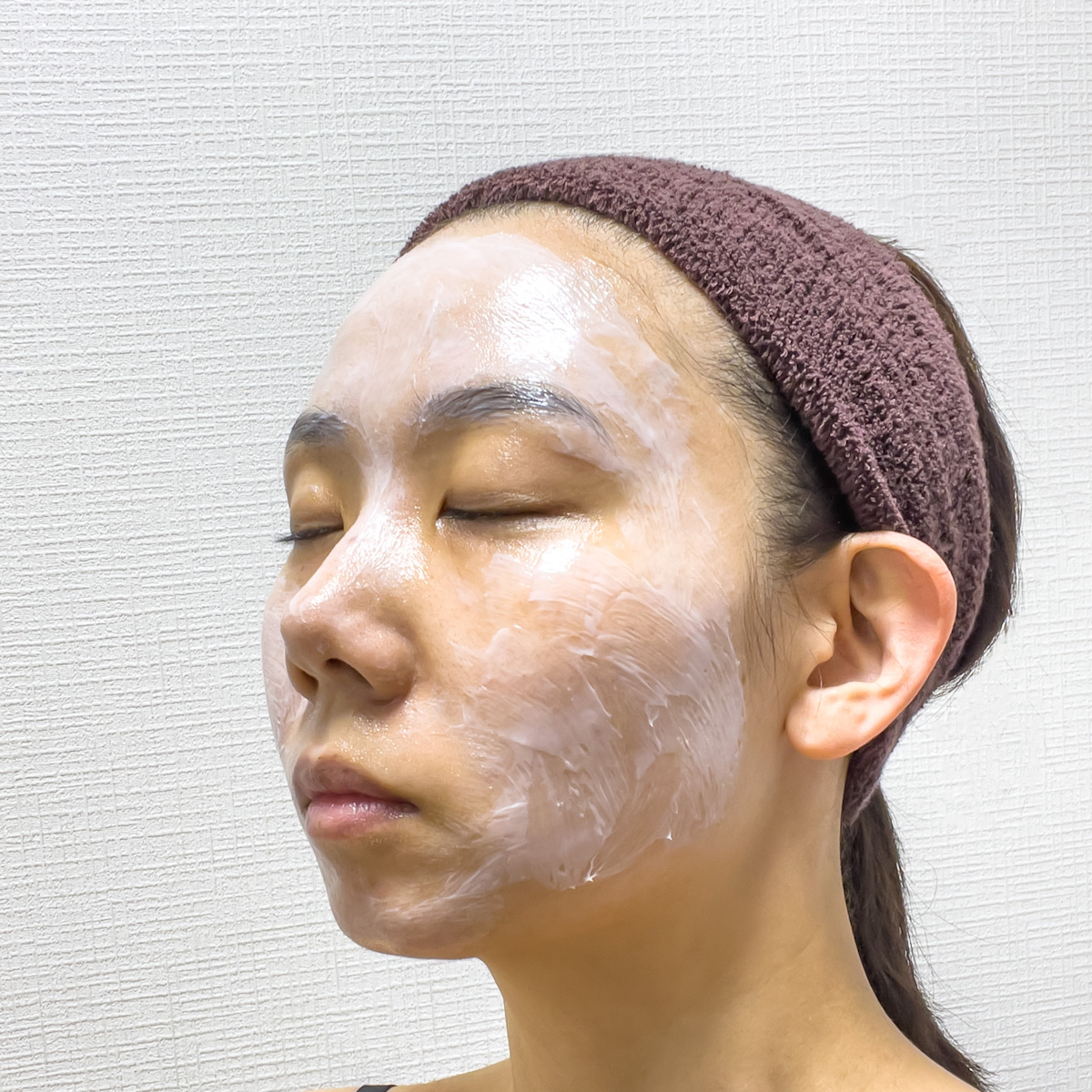 その後、マスクを伸ばし、柔らかいスポンジ等でマスクを拭き取り、ぬるま湯で洗い流すことで不要な皮脂や角質を優しく取り除きます。