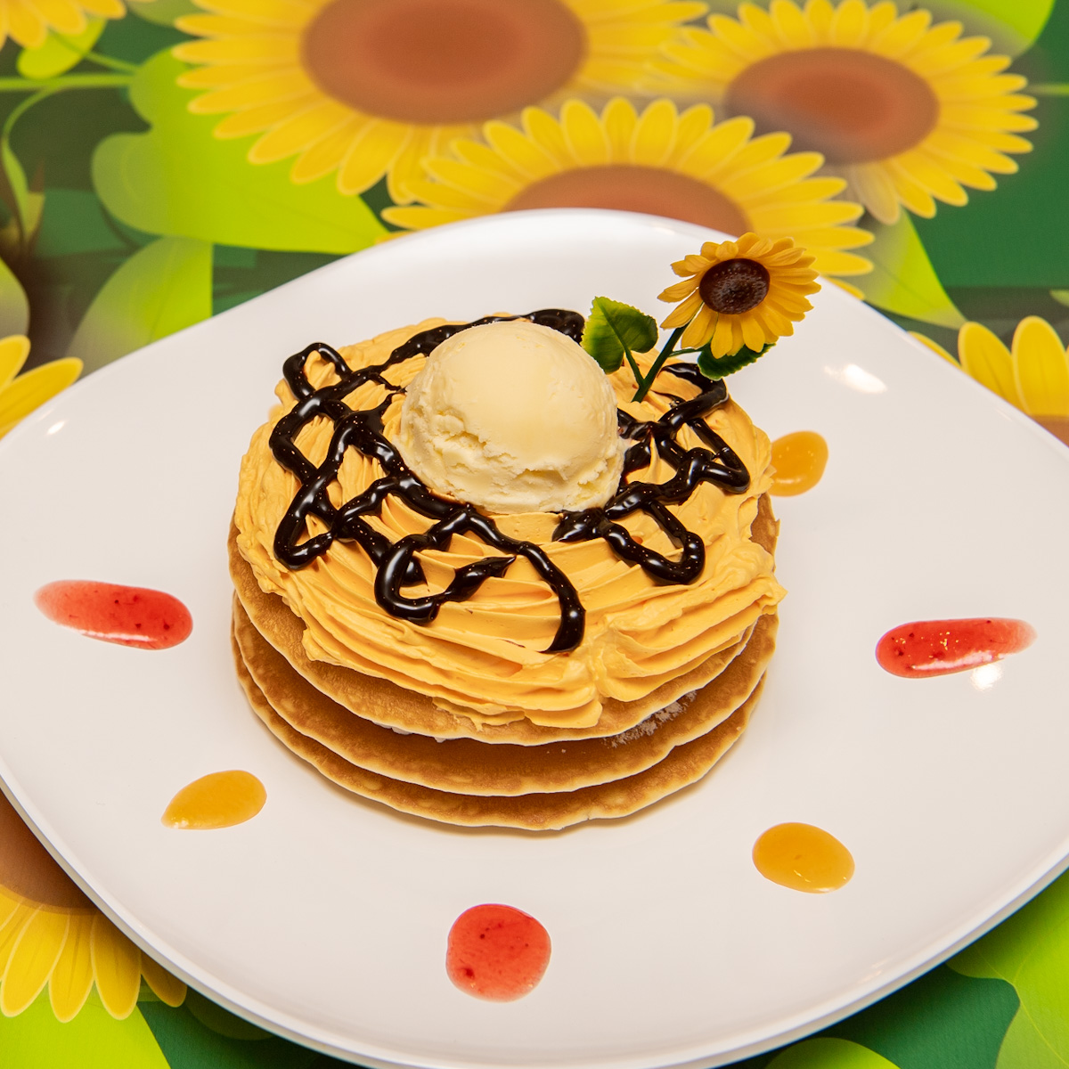 クリームをサンドしたパンケーキを3枚重ねた「ひまわりパンケーキ」