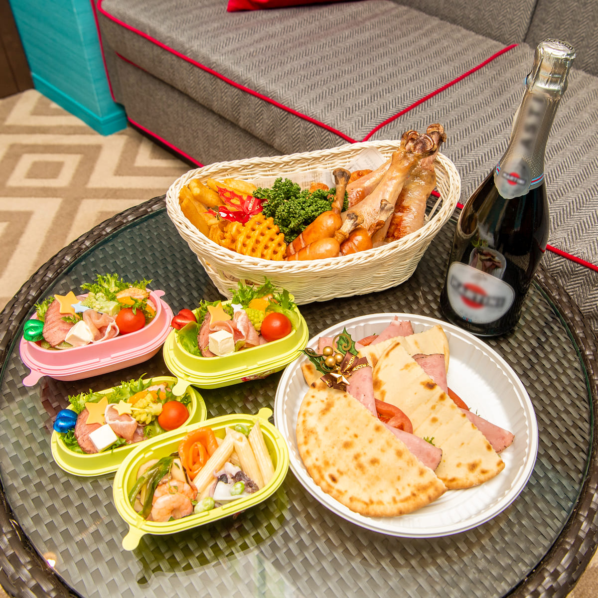 大きなバスケットには、「唐揚げ」「フライドポテト」「骨付きフランク」「スモークターキーレッグ」といったパーティーの定番メニューを豪快に盛り合わせ。