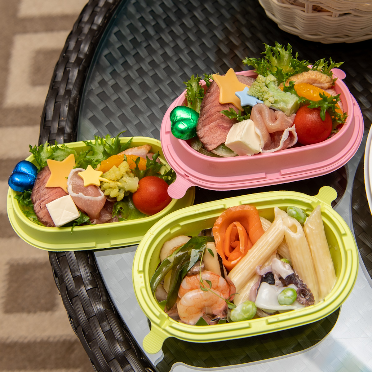 オードブルは2層になったランチボックスのような容器で人数分提供。