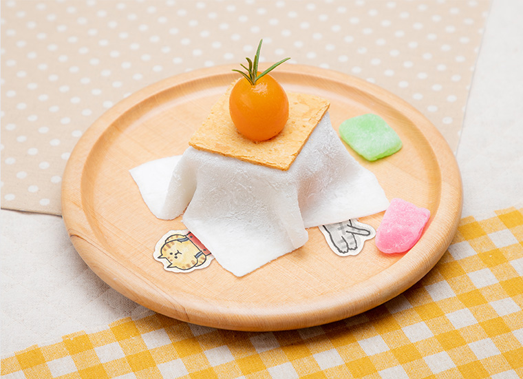 「にゃんすけ」たちがごろごろとくつろぐこたつを再現したスイーツです。