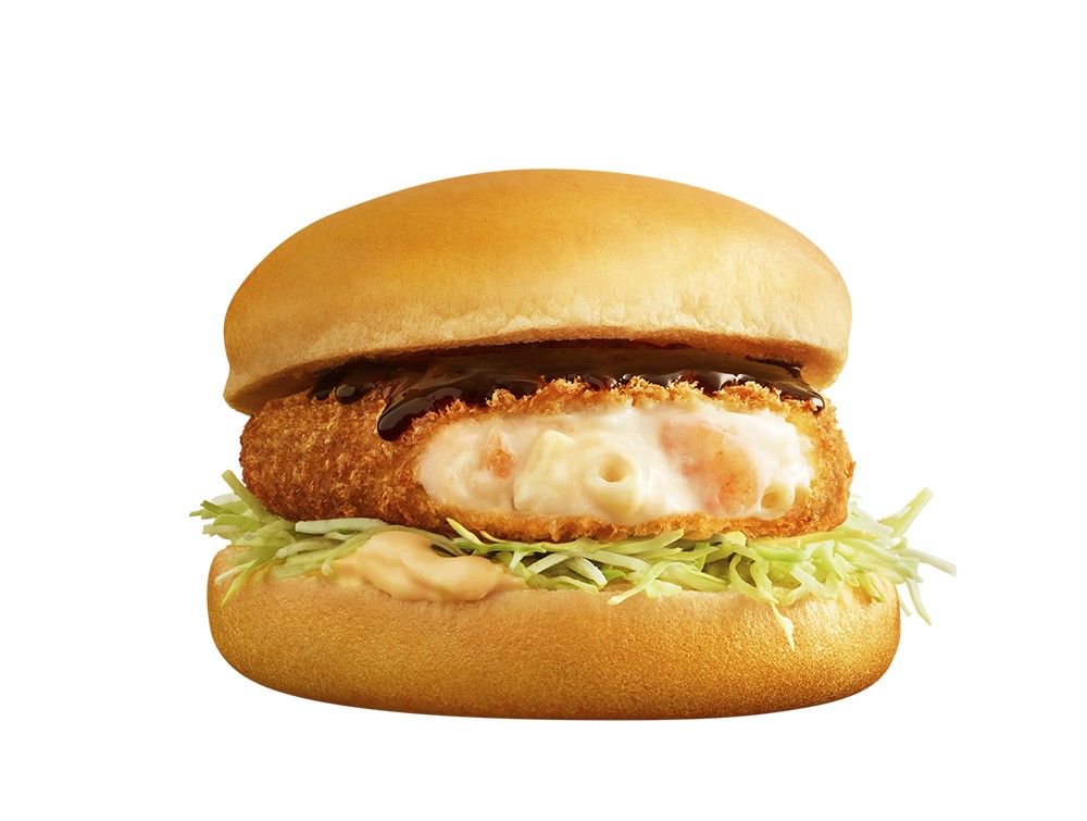 クリーミーなホワイトソースに相性抜群のえびとマカロニを加え、外はサクサク、中はトロトロのグラタンコロッケをサンドしたバーガー「グラコロ」