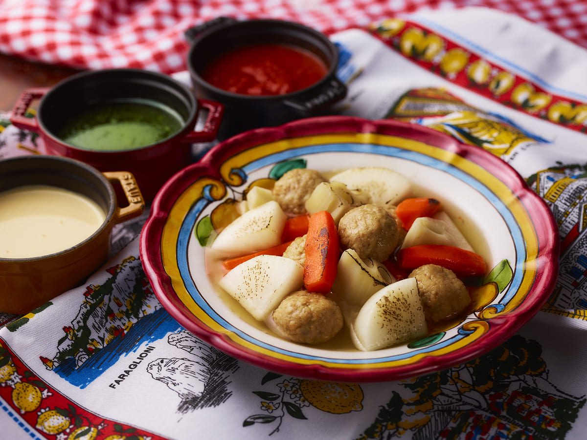 3種のソースを好みで付けて味わう「イタリア風おでん」は、あつあつのトマトスープで煮込まれ、寒い日に嬉しいメニューです。