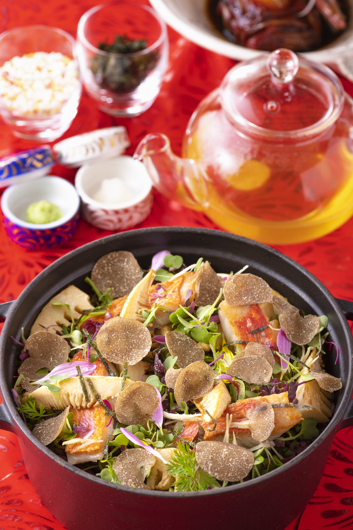 「トリュフ香る金目鯛と筍のココットご飯 鰹だしと茶葉のコラーゲンスープとともに」の紹介でした。