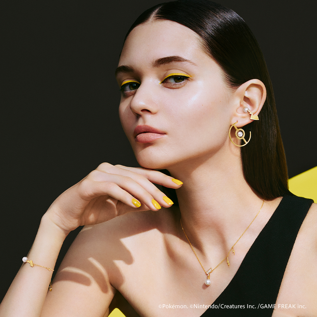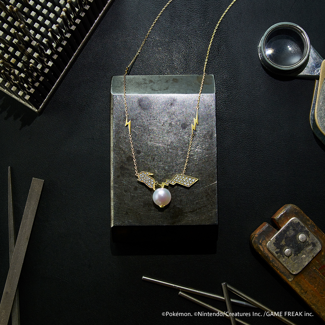 アコヤパールに「ピカチュウ」のしっぽのアイコンが映えるユニークなデザインのネックレス、ブレスレットは、アシンメトリーに配された稲妻型のプレートと、エンドプレートになっている「ピカチュウプレート」がポイント。