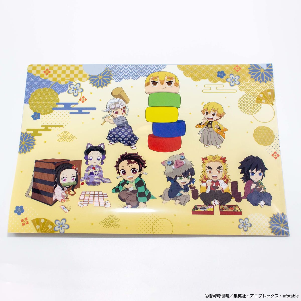 今回紹介する郵便局限定『鬼滅の刃』グッズは、かるたを楽しむ「竈門炭治郎」「竈門禰󠄀豆子」「胡蝶しのぶ」、お雑煮やおせちを食べる「嘴平伊之助」「富岡義勇」「煉獄杏寿郎」、だるま落としを楽しむ「宇髄天元」と、ヒヤヒヤしながら見ている「我妻善逸」などの季節感溢れるデザイン。