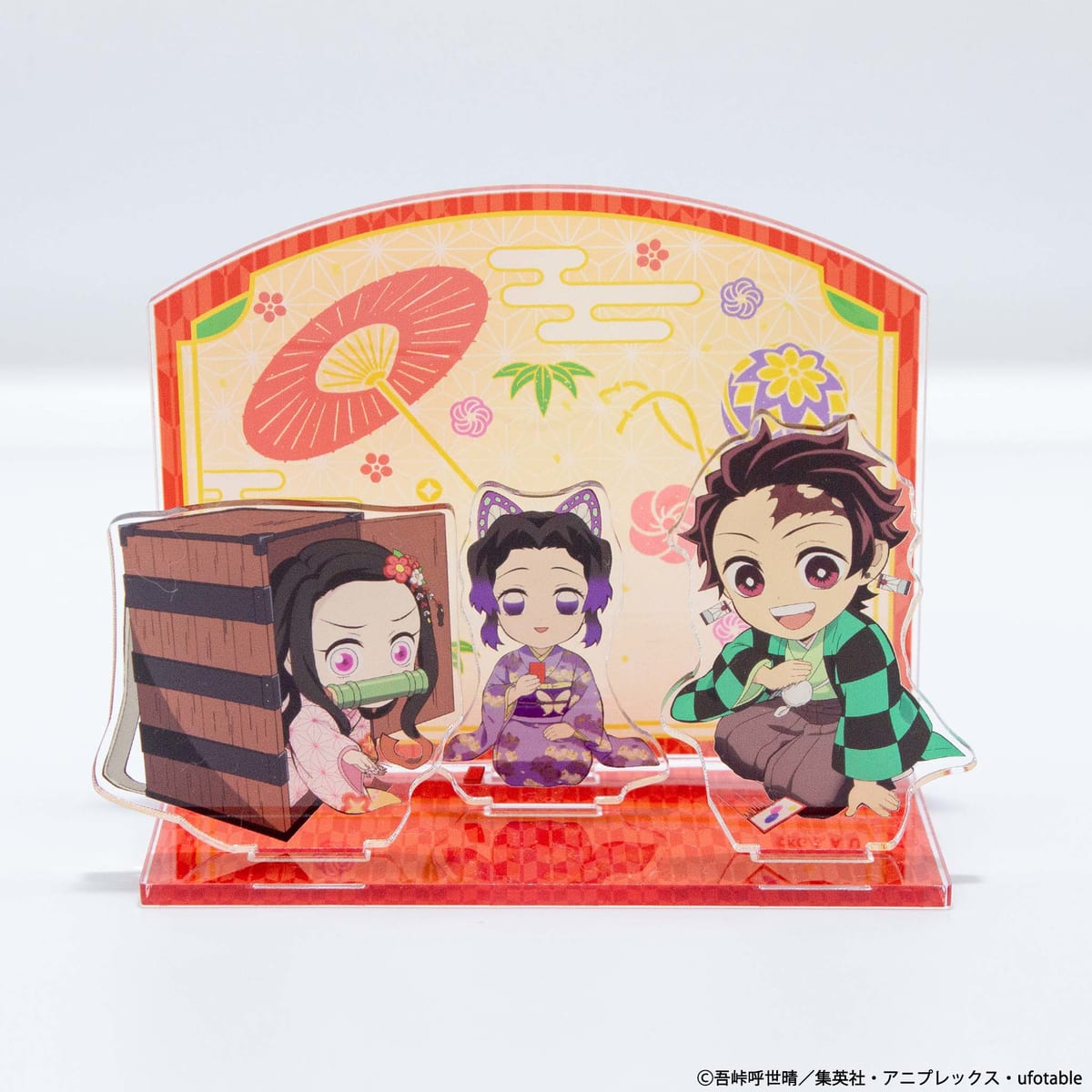 「アクリルスタンド A」は、組み立てると「竈門炭治郎」「竈門禰󠄀豆子」「胡蝶しのぶ」がかるたを楽しむ一場面が完成。