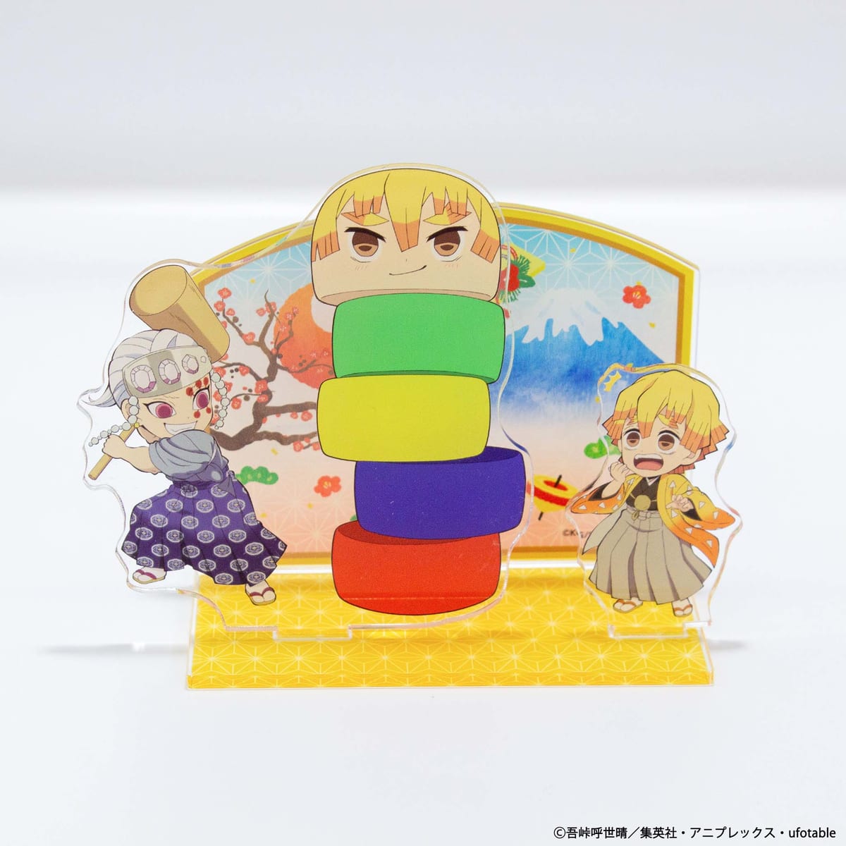 「アクリルスタンド C」は、だるま落としを楽しむ「宇髄天元」と、ヒヤヒヤしながら見ている「我妻善逸」のデザインです。