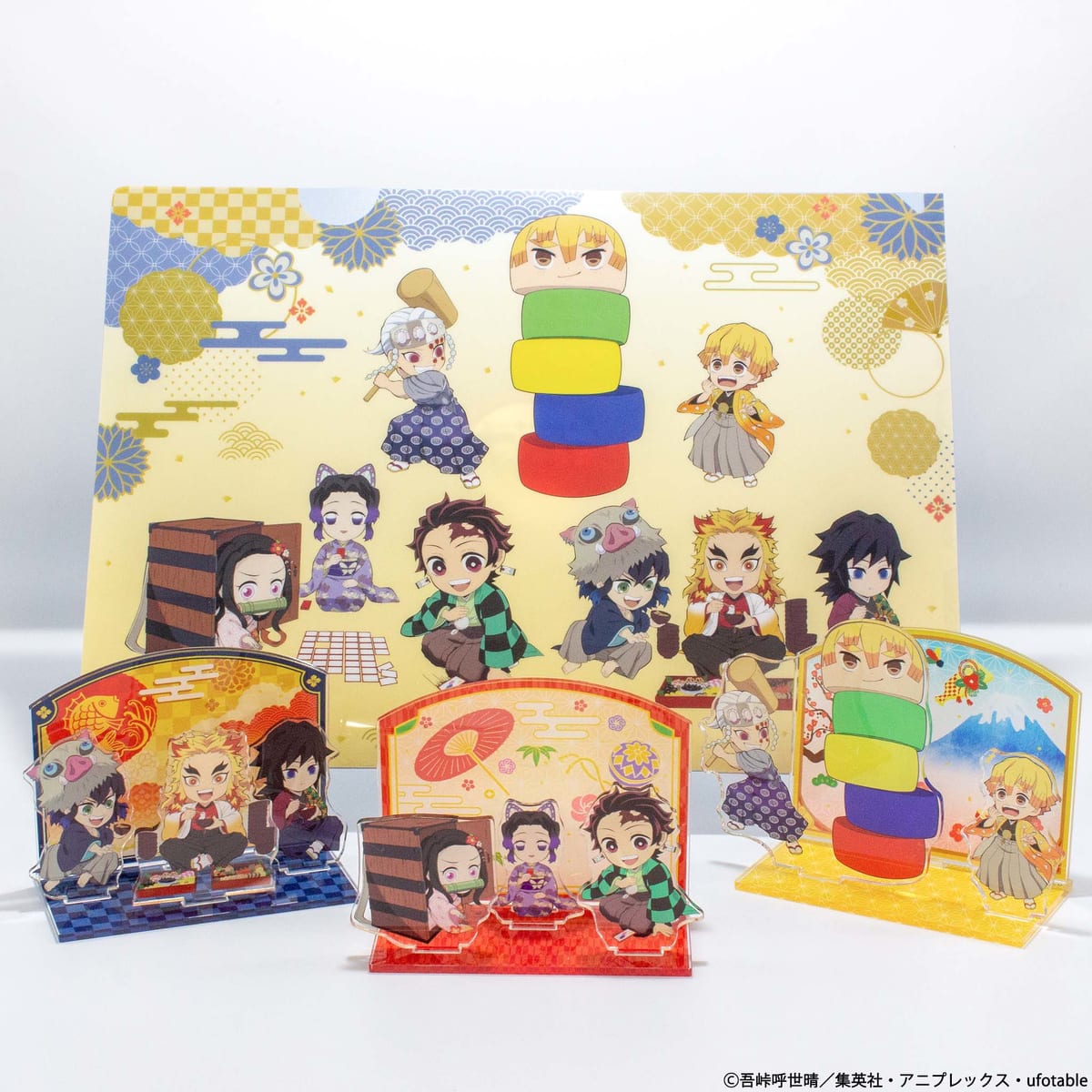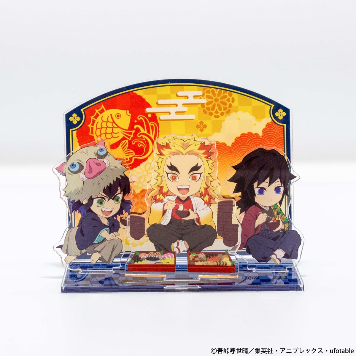 「アクリルスタンド B」は、組み立てるとお雑煮やおせちを食べる「嘴平伊之助」「富岡義勇」「煉獄杏寿郎」の3人のアクリルジオラマスタンドに。