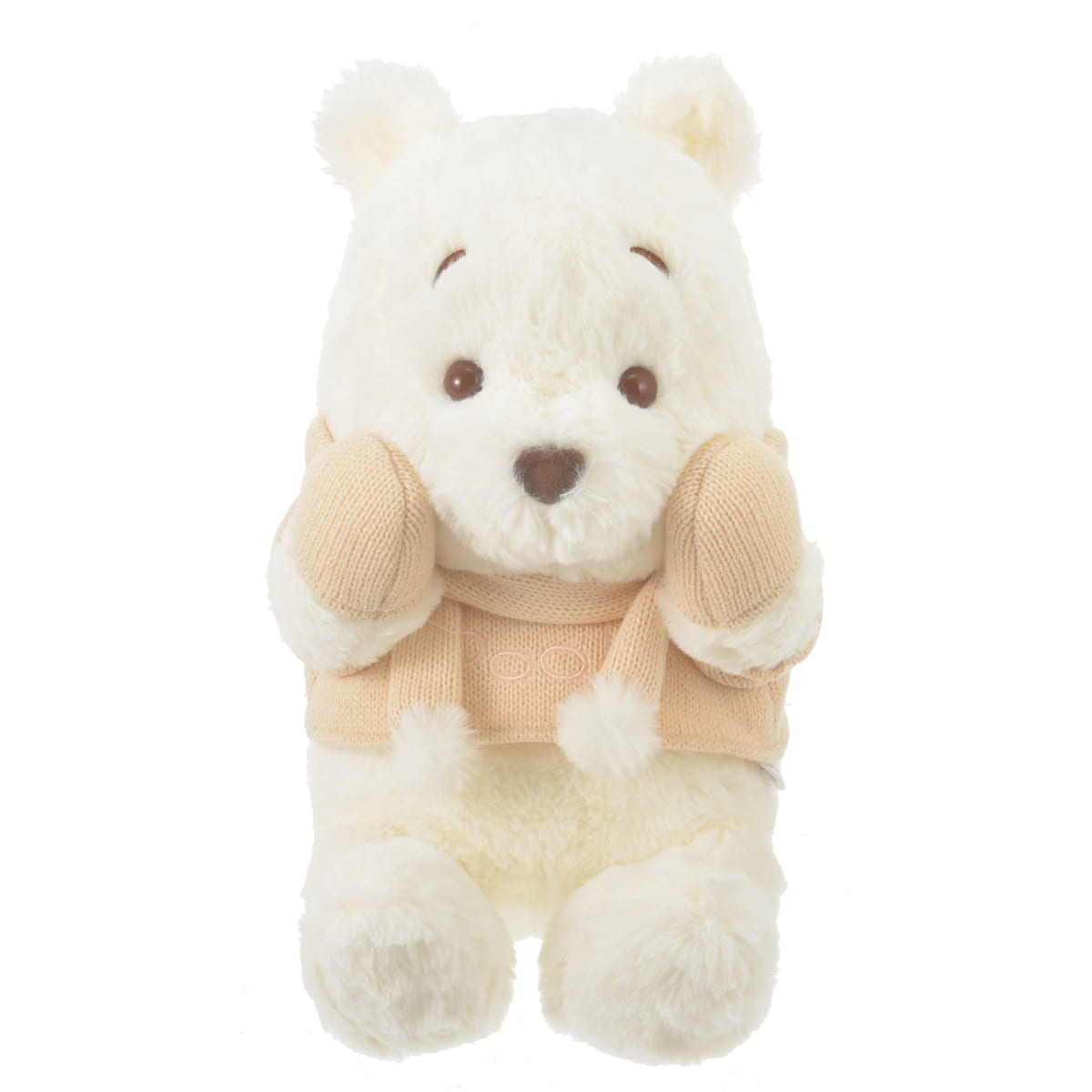 可愛らしいサイズ感で登場する、ふんわり白い「プーさん」のぬいぐるみ。