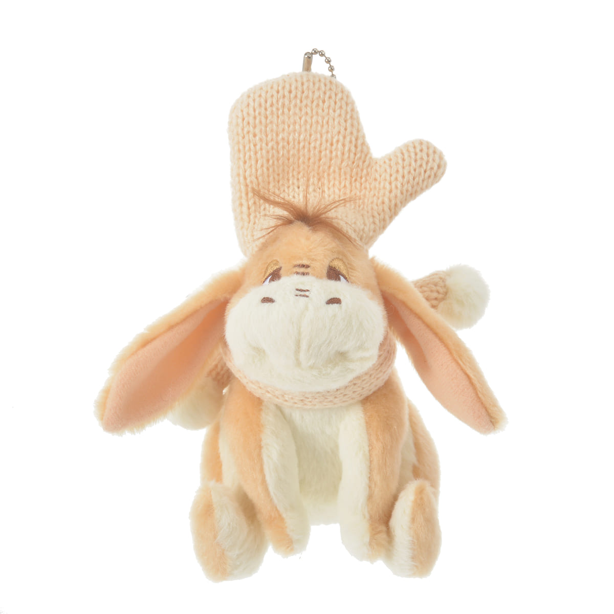 ポンポン付きマフラーであったか冬支度をした「イーヨー」のぬいぐるみキーチェーン。