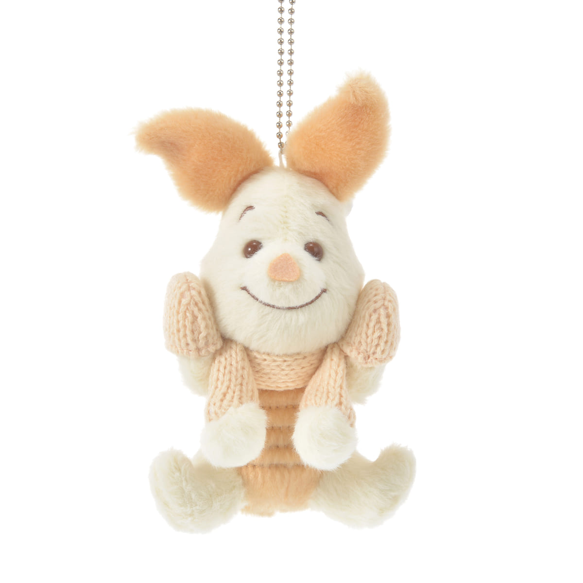 ニッコリ笑顔で頬に手を当てる「ピグレット」のぬいぐるみキーチェーン。