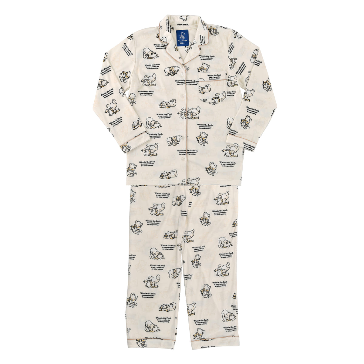 「プーさん」のイラストが可愛い、総柄プリントの長袖パジャマ。