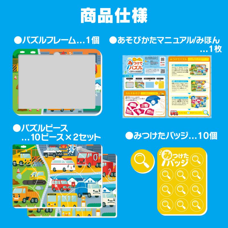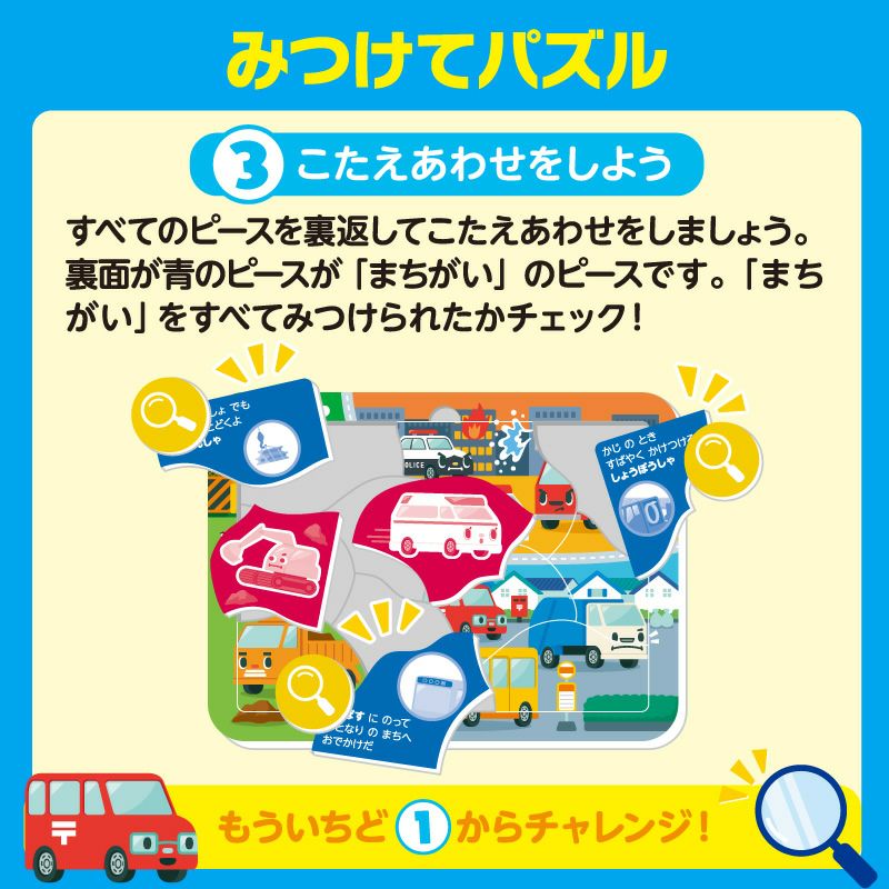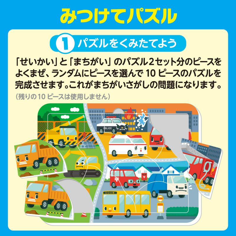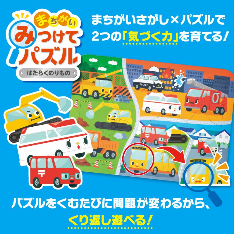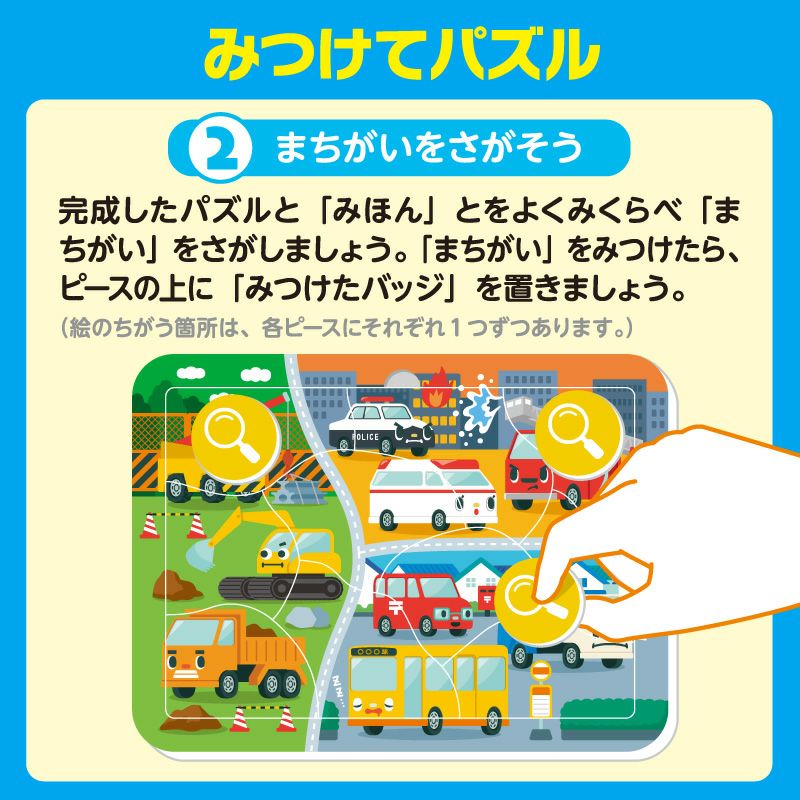 消防車やショベルカー、バスなどの乗り物のイラストが描かれた「みつけてパズル」