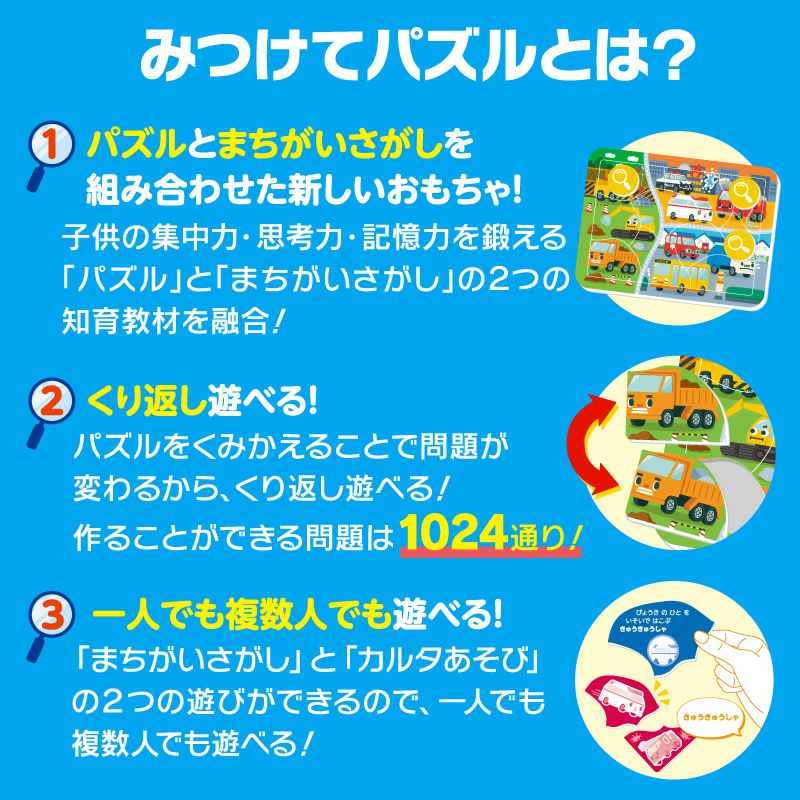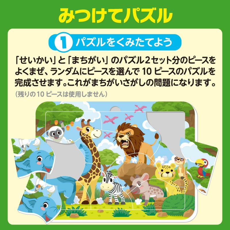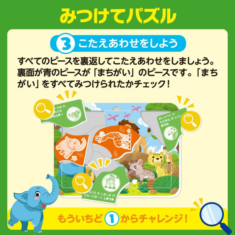 「みつけてパズル」はまちがいさがしとパズルを組み合わせた、「気づく力」を育てる玩具。