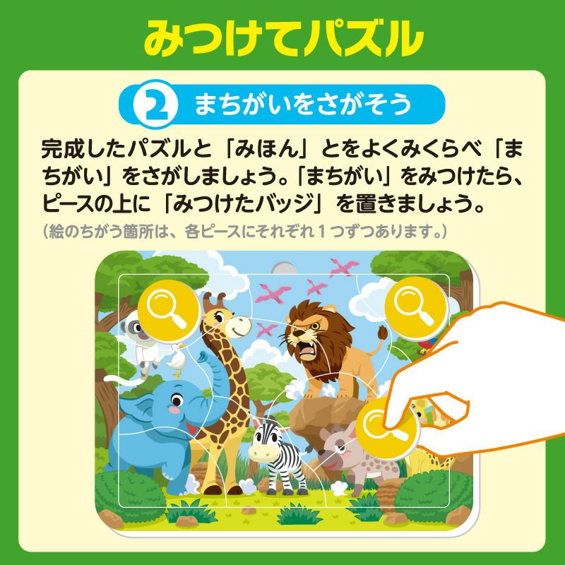 パズルの絵と「みほん」を見比べて、まちがいを見つけたら「みつけたバッジ」を置きます。