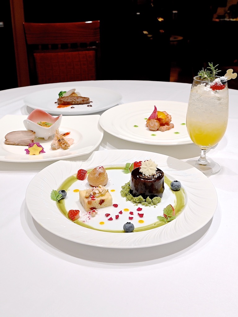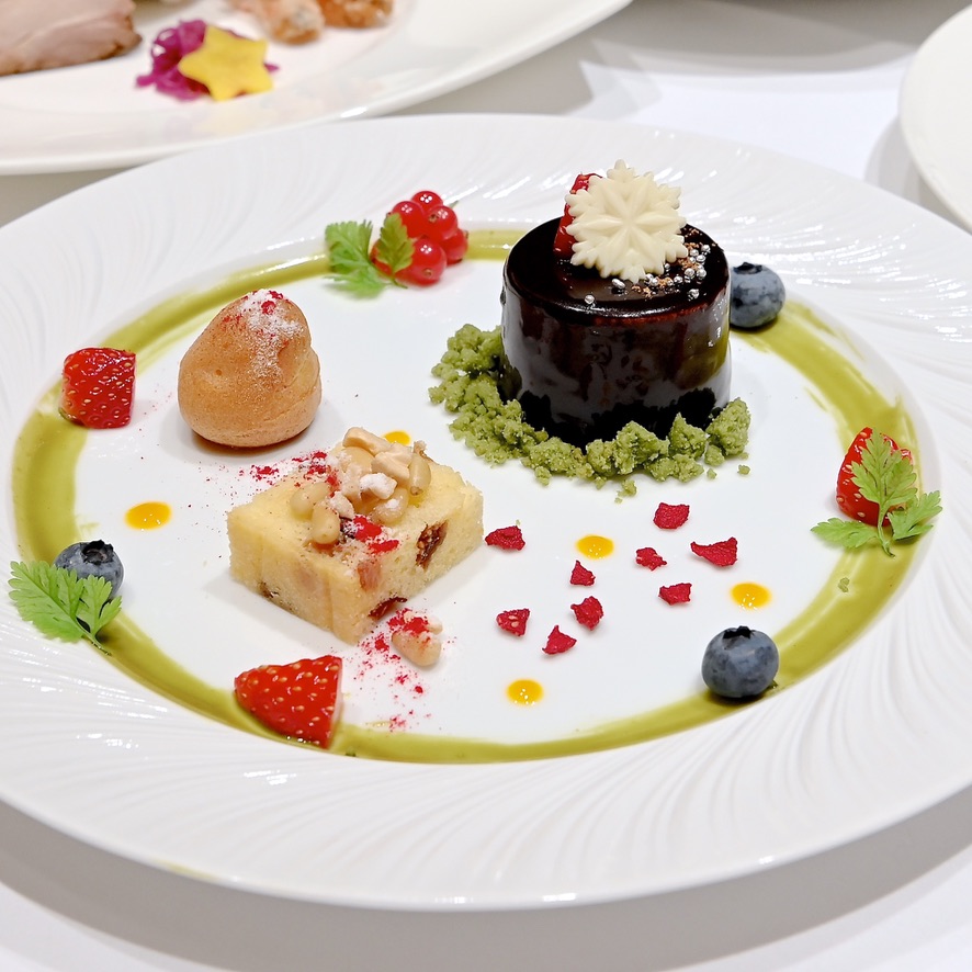 シュトーレンをイメージした蒸しカステラや、杏仁霜(アンニンスー)を使用したプチシューなど一皿で様々な味を楽しむことができます。