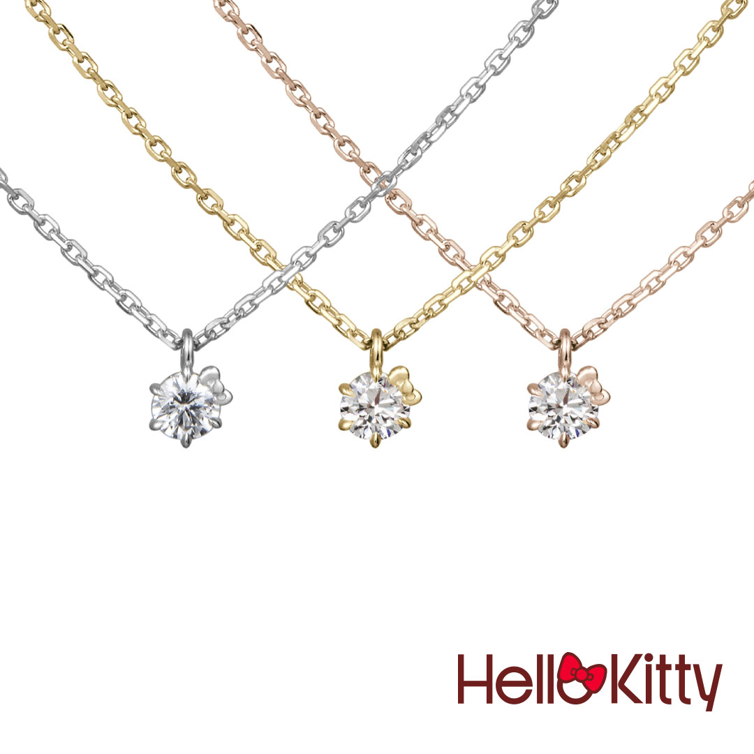 シンプルな一粒石ダイヤモンドのネックレスに、「ハローキティ」のリボンがモチーフになっています。