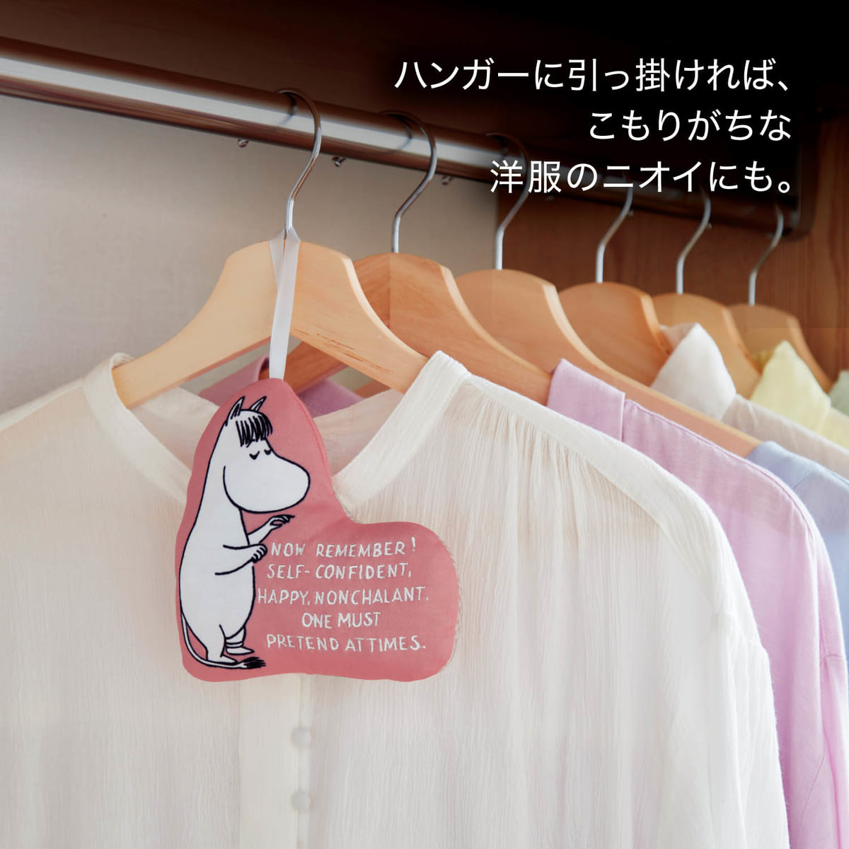 ベルメゾン「ムーミン」バイオパワーで消臭ふわふわサシェ ハンガーに引っ掛ければ、こもりがちな洋服のニオイにも。