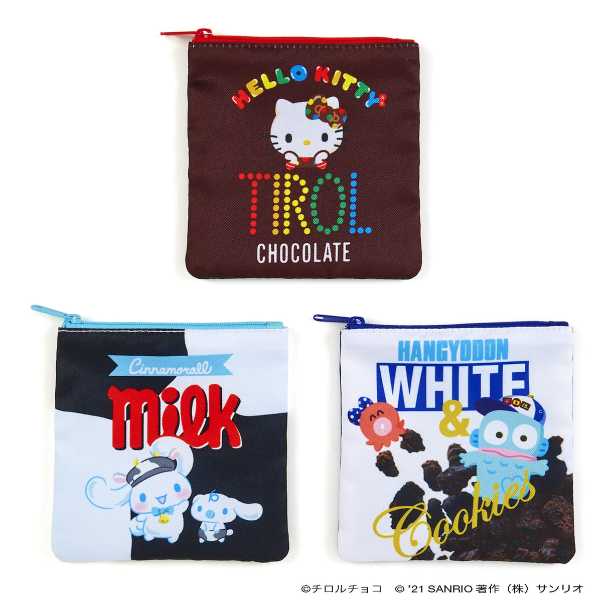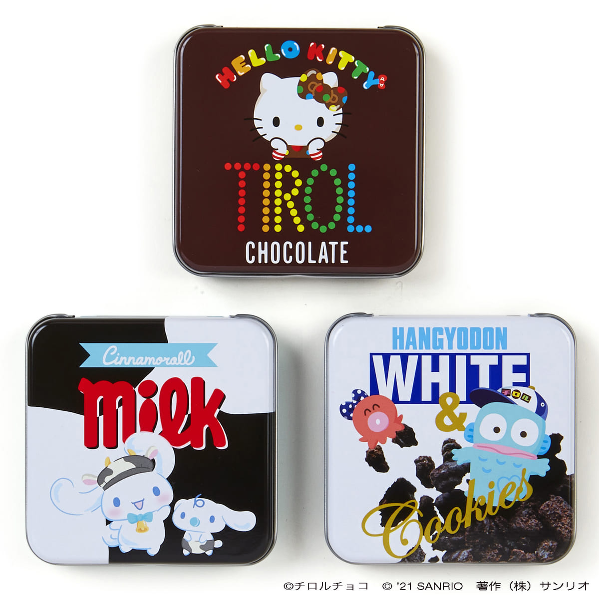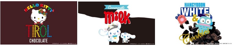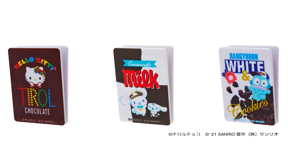 「ハローキティ」デザインにはコーヒーヌガー味、「シナモロール」デザインにはミルク味、「ハンギョドン」デザインにはホワイト&クッキー味のチロルチョコがそれぞれ3つセットされています。