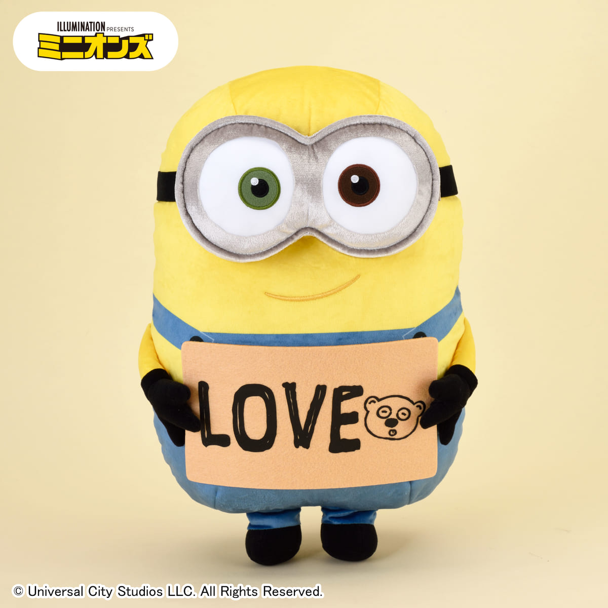 大きく「LOVE」と書かれたメッセージボードを持つ「ボブ」のギガジャンボぬいぐるみ。